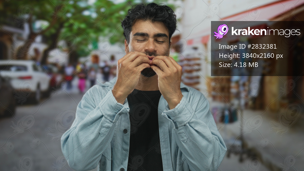 Hispanic man pinches moustache for grooming by souvenir stall in busy city street market outdoors; self care confidence leisure.