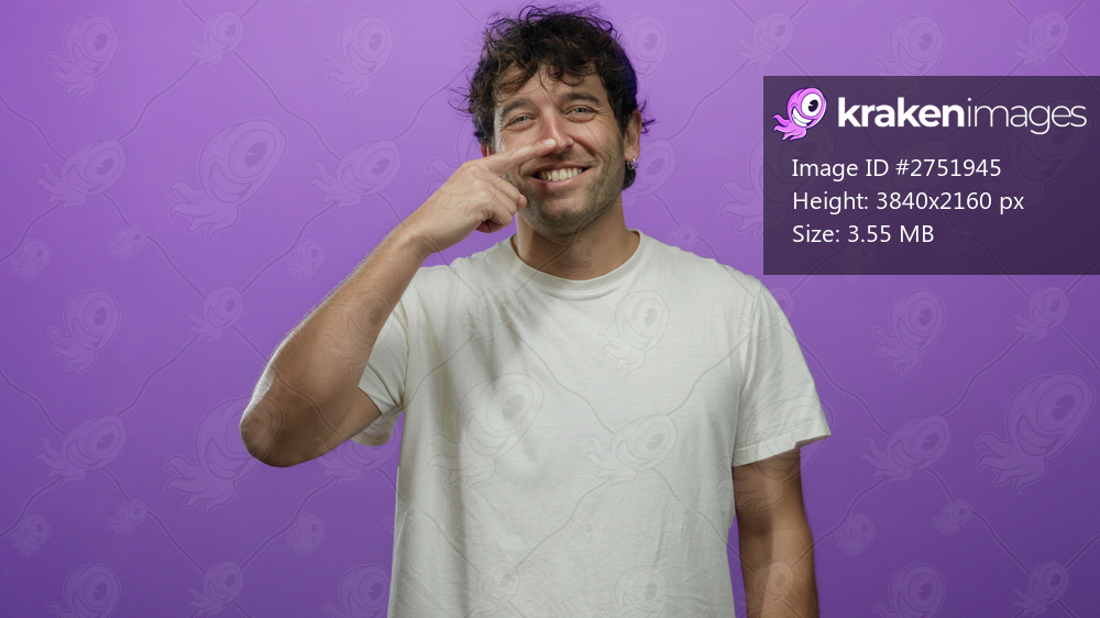 Hispanic man playfully touches his nose with a finger against a vibrant purple background, wearing a casual white shirt and displaying a charming smile. - Kraken Images