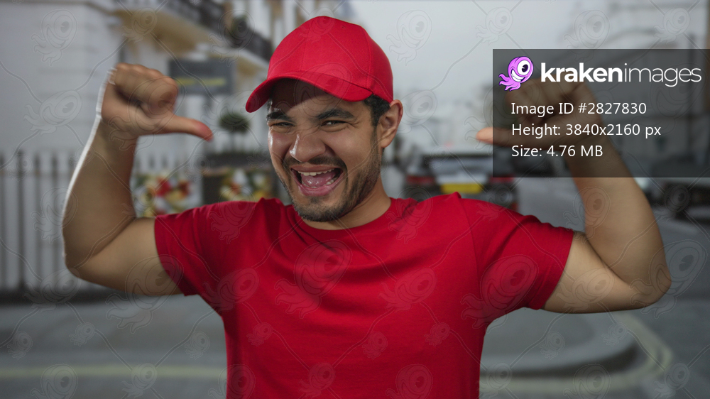 Hispanic man pointing thumbs to chest on busy street under red cap while smiling in broad daylight; pride.