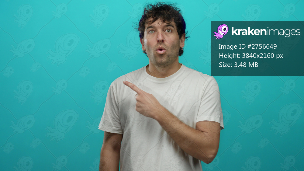 Hispanic man points aside surprised against blue background, wearing a white shirt and showing an expressive facial expression with an amusing and captivating appearance. - Kraken Images