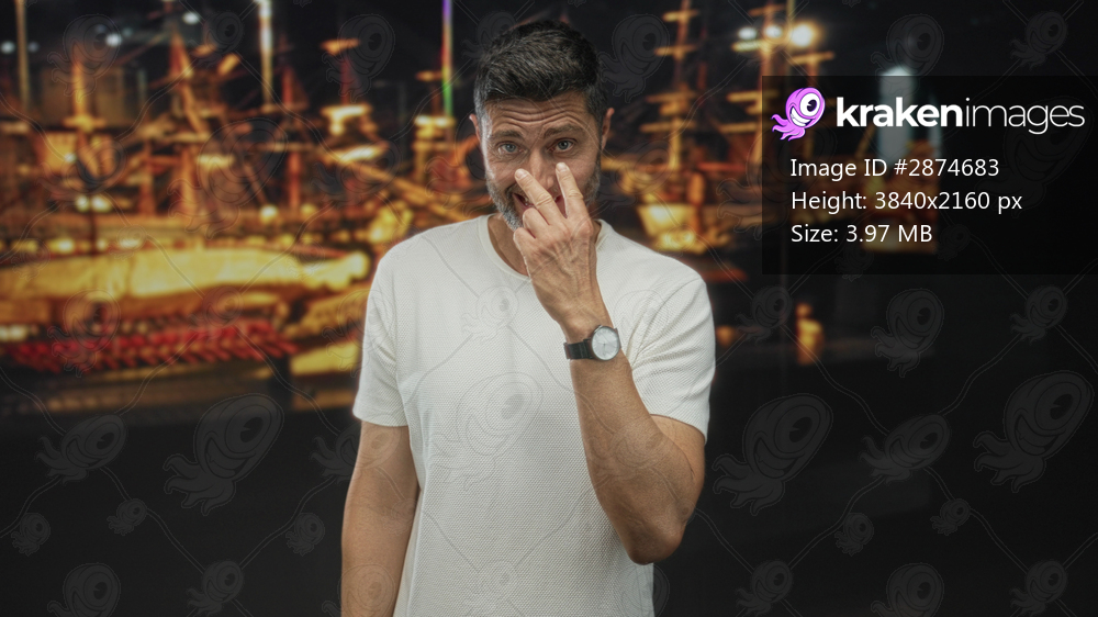 Hispanic man points finger at camera in a museum building with naval ship models and watch visible on wrist; friendly confidence.