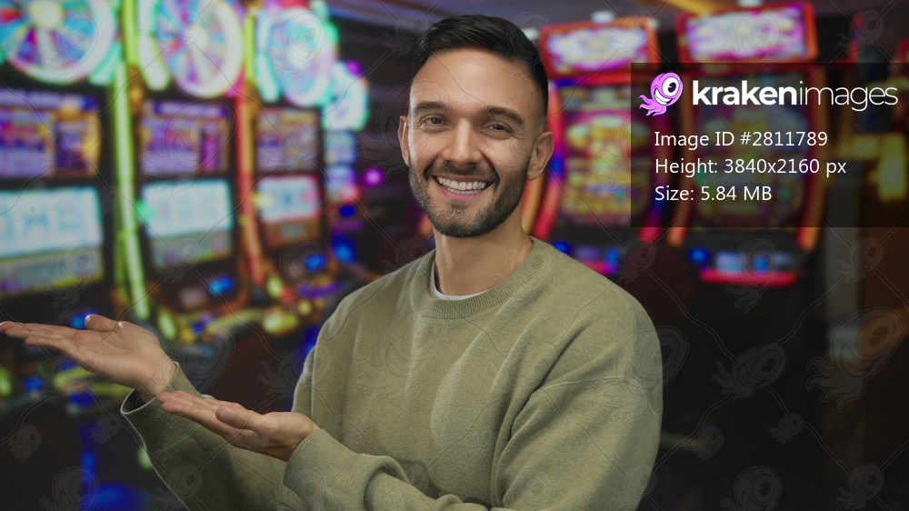 Hispanic man presenting something with a warm smile in a vibrant indoor casino setting surrounded by colorful slot machines reflecting a lively gaming atmosphere. - Kraken Images