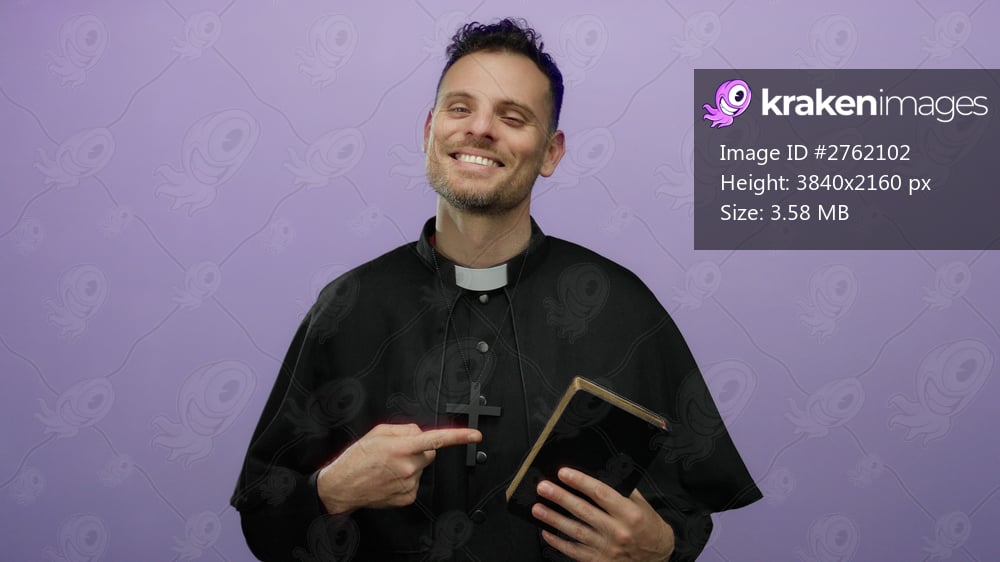 Hispanic man priest pointing at a bible, wearing black clerical attire, smiling confidently against an isolated purple background.