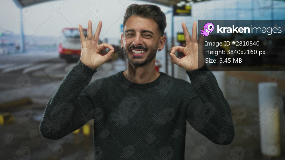 Hispanic man with raised hands making ok sign while smiling at airport terminal; approval confidence.