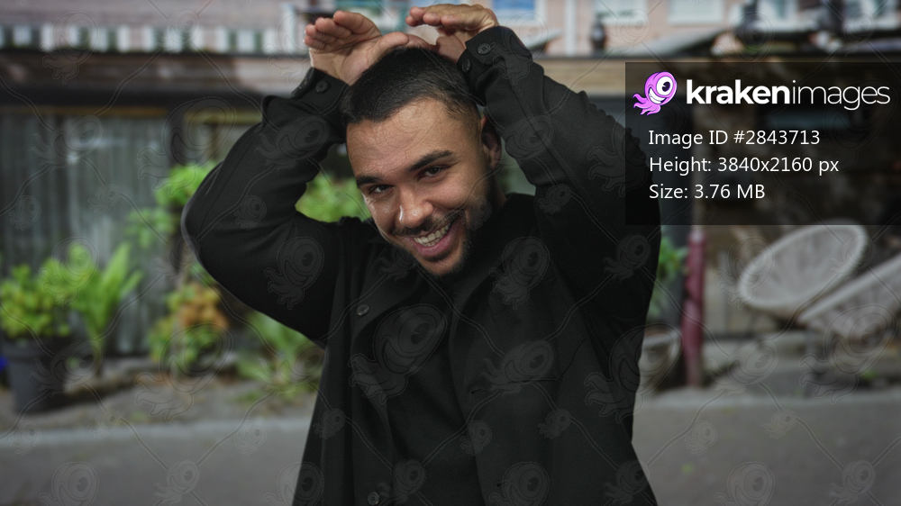 Hispanic man raises hands to head in street entrance of urban building while smiling broadly at camera; joy playfulness.