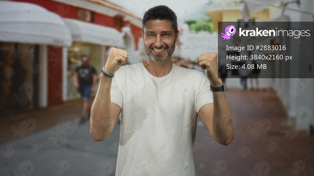 Hispanic man raising both fists and smiling while standing center frame on a sunlit street lined with shops and awnings; joy victory celebration.