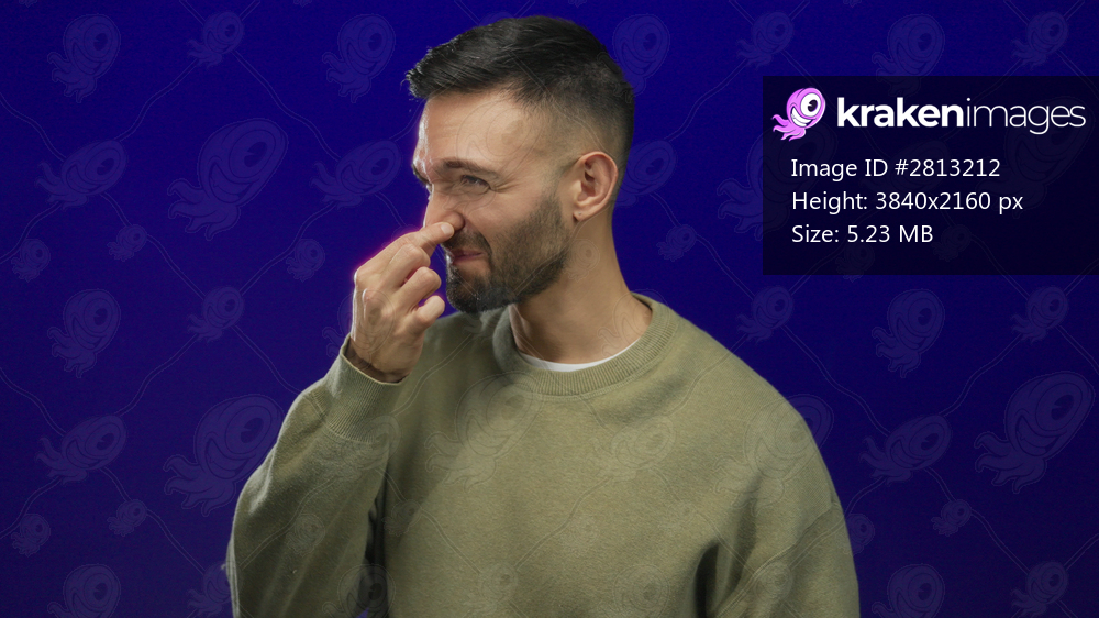 Hispanic man scrunching nose against blue background depicts displeasure due to bad smell, wearing casual green sweater, expressing facial reaction in studio setting. - Kraken Images