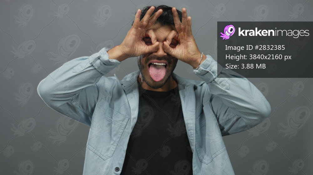 Hispanic man with short black hair making binocular gesture with hands and showing tongue in grey studio; playfulness.