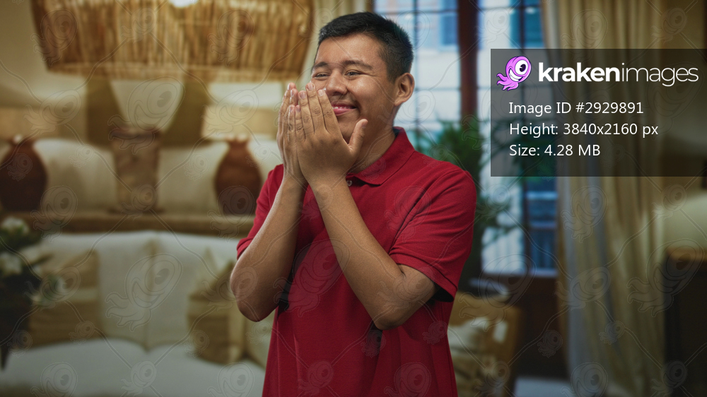 Hispanic man smiling broadly and clasping his hands near his face in building living room; home comfort joy.