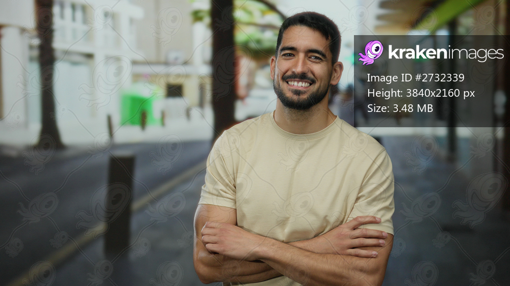 Hispanic man smiling confidently with arms crossed on an urban street in a city, showcasing his attractive and casual demeanor in an outdoor setting.