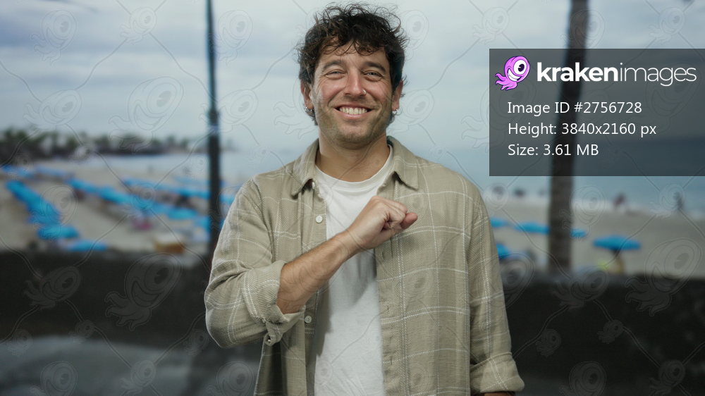 Hispanic man smiling confidently at camera with fist extended on a tropical beach with palm trees and blue umbrellas in the background.