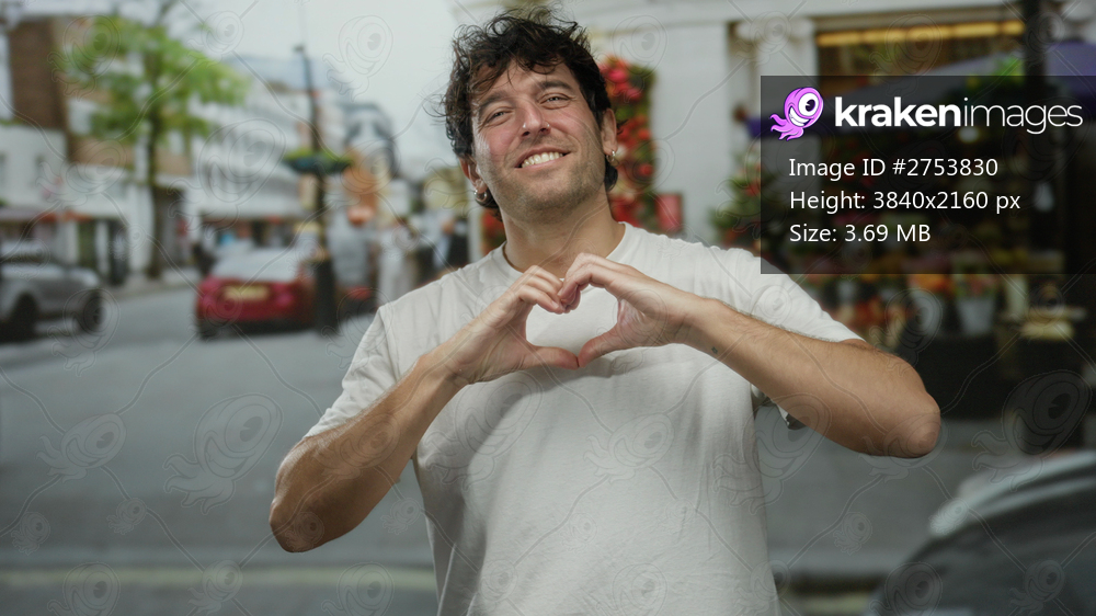 Hispanic man smiling and gesturing a heart sign on a bustling city street, wearing a white shirt, and pointing at the camera.