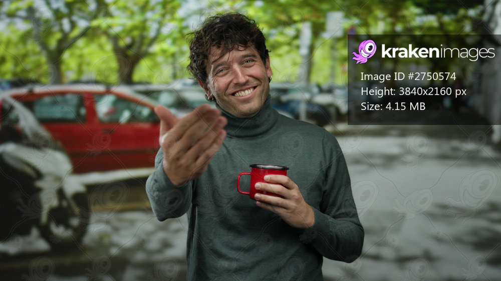 Hispanic man smiling and gesturing come with a hand while holding a coffee cup on a vibrant outdoor street scene.