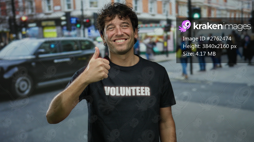 Hispanic man smiling and giving a thumbs-up on a busy street, wearing a volunteer shirt, surrounded by urban outdoor activity and pedestrians.
