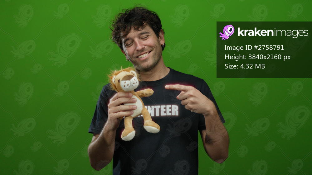 Hispanic man smiling and holding a stuffed animal against a vibrant green background in a volunteer setting.