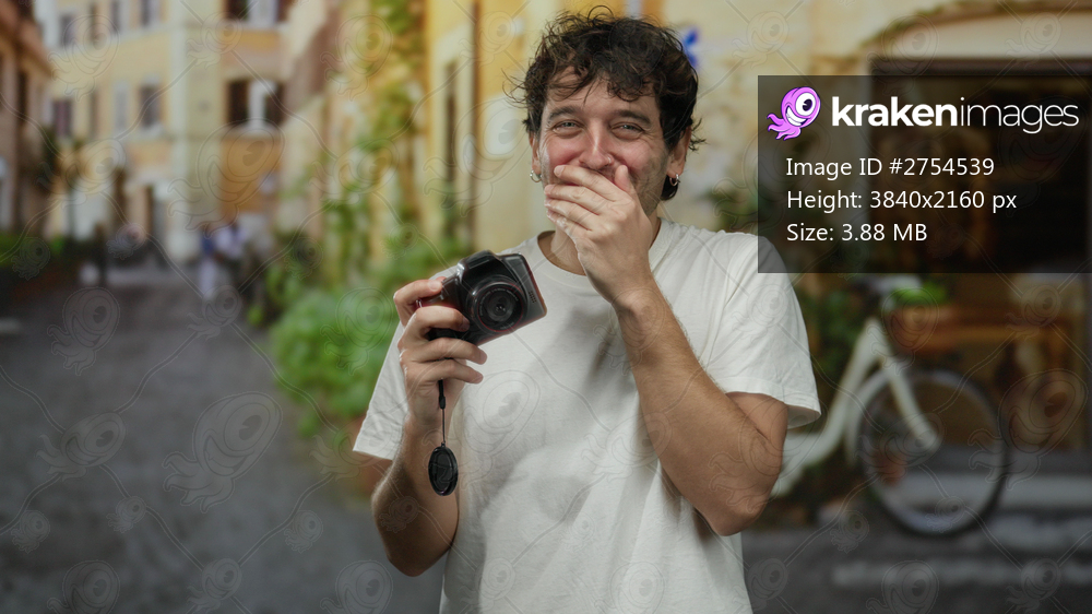 Hispanic man smiling and holding camera in charming mediterranean town, creating a lively scene capturing photography in a picturesque old street.