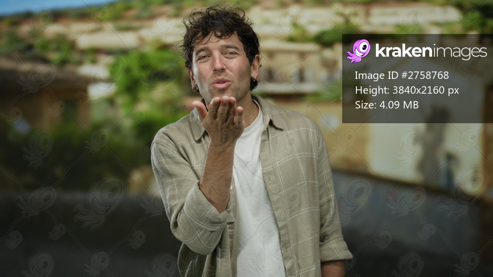 Hispanic man smiling in a charming mediterranean town, wearing casual attire, conveys warmth and friendliness amidst traditional rustic architecture.