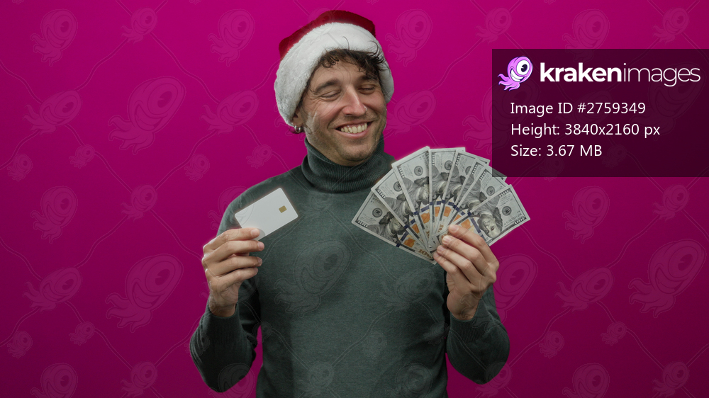 Hispanic man smiling in a christmas hat holding a white credit card and us dollar bills against a vibrant pink background.