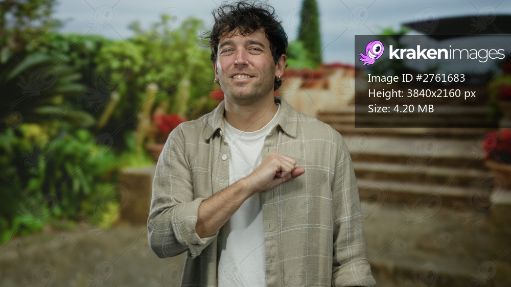 Hispanic man smiling in a picturesque mediterranean town garden with steps and vibrant plants, exuding joy and friendliness.