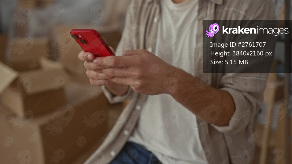 Hispanic man smiling in new home using smartphone surrounded by moving boxes and unpacked belongings, embodying excitement and fresh beginnings in a modern living space. - Kraken Images