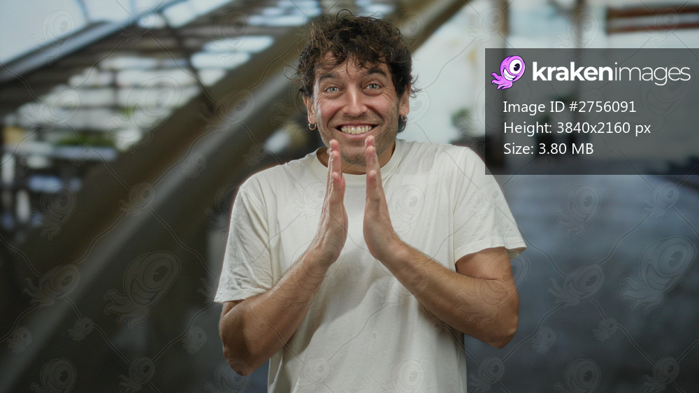 Hispanic man smiling indoors at an airport with hands clasped, expressing joy and friendliness in a travel setting.