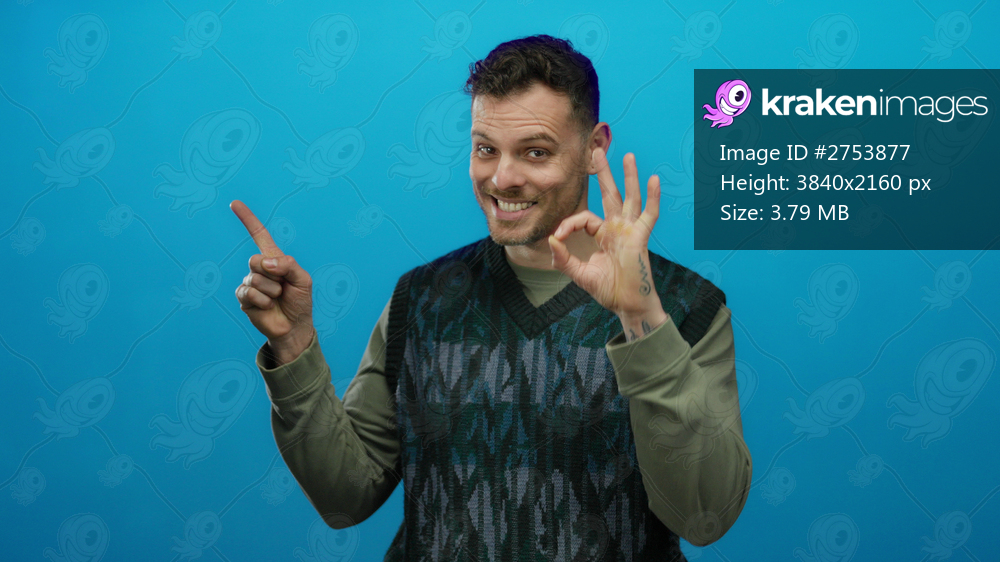 Hispanic man smiling and making an ok gesture while pointing sideways against a vibrant blue background, conveying positivity and confidence.