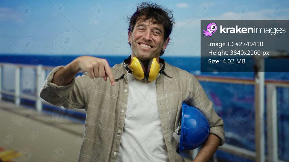Hispanic man smiling on a cruise ship deck, wearing noise-canceling headphones and holding a blue hardhat with the ocean in the background.