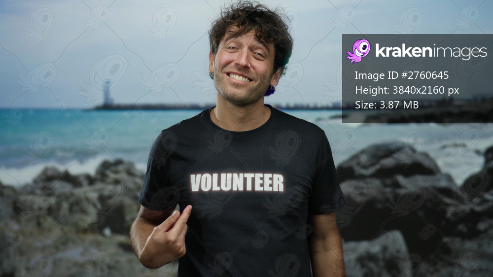 Hispanic man smiling on the beach points to his volunteer shirt with the sea and rocks in the background, conveying community spirit and environment awareness. - Kraken Images