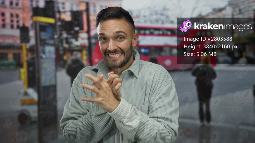 Hispanic man smiling on urban street with red bus and pedestrians visible in the city background showing an energetic atmosphere outdoors.