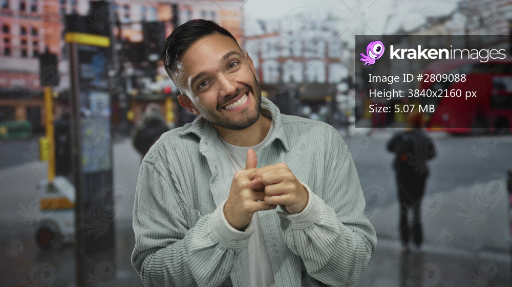 Hispanic man smiling on urban street with red bus and pedestrians visible in the city background showing an energetic atmosphere outdoors.