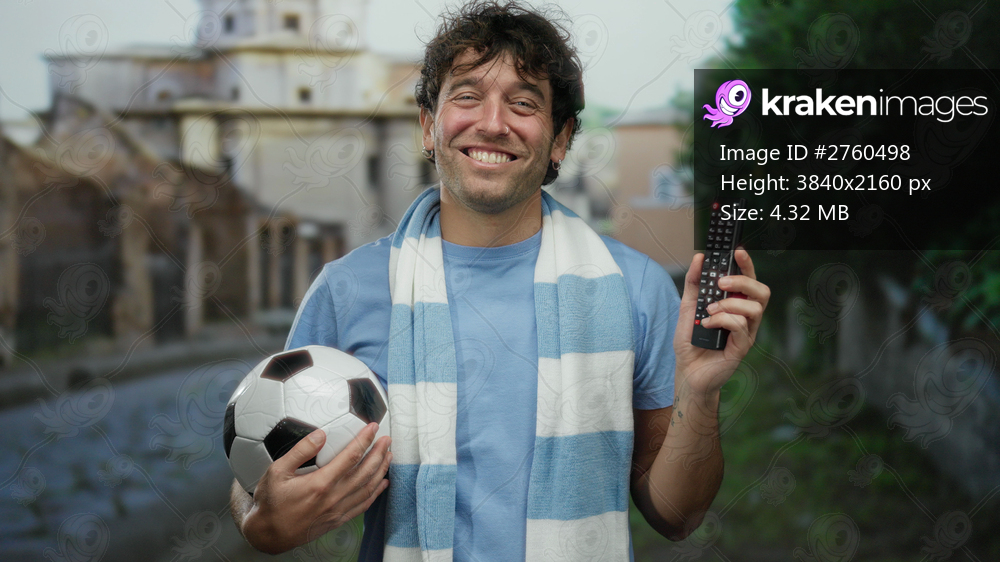 Hispanic man smiling outdoors holding a football and a remote on a street showcasing sports enthusiasm and casual style.