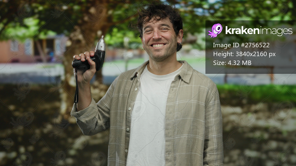 Hispanic man smiling outdoors holding screwdriver under tree with blurred background, showcasing a relaxed atmosphere and casual attire in an urban street setting. - Kraken Images