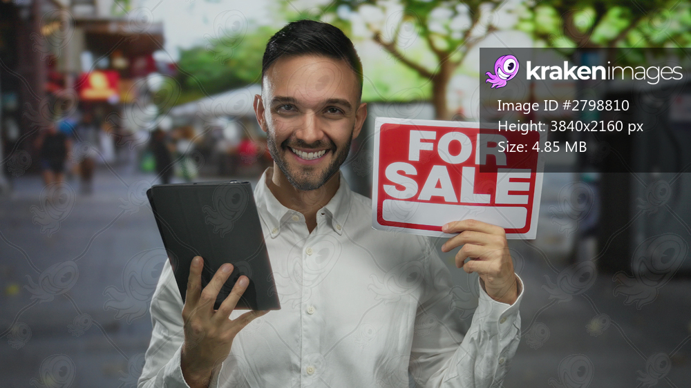 Hispanic man smiling with tablet and for sale sign standing outdoors in bustling urban street