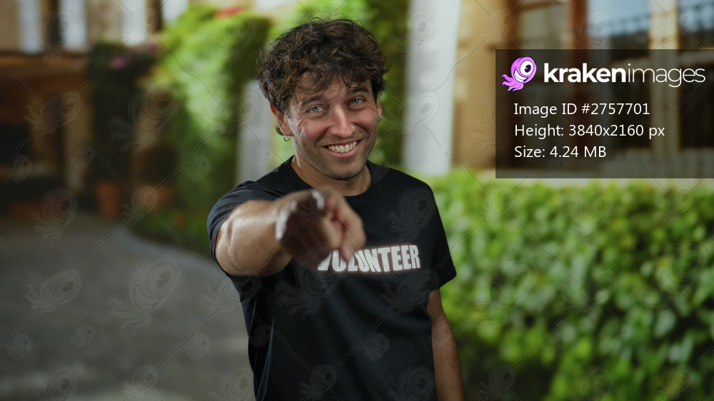 Hispanic man smiling wearing volunteer shirt in mediterranean town with green background showcasing community spirit and friendliness outdoors