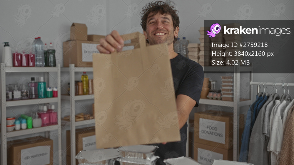 Hispanic man smiling while holding a paper bag in a donation room surrounded by shelves of supplies and food boxes, showcasing his volunteer work in a community setting. - Kraken Images