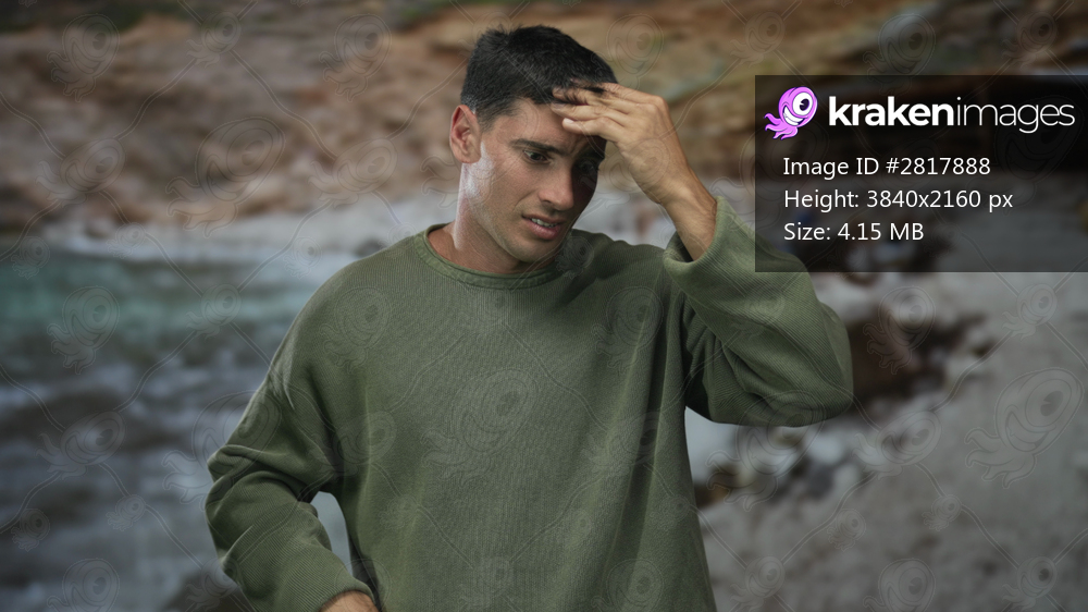 Hispanic man spreads hands at rocky beach under warm sunlight showing puzzled shrug gesture; uncertainty.
