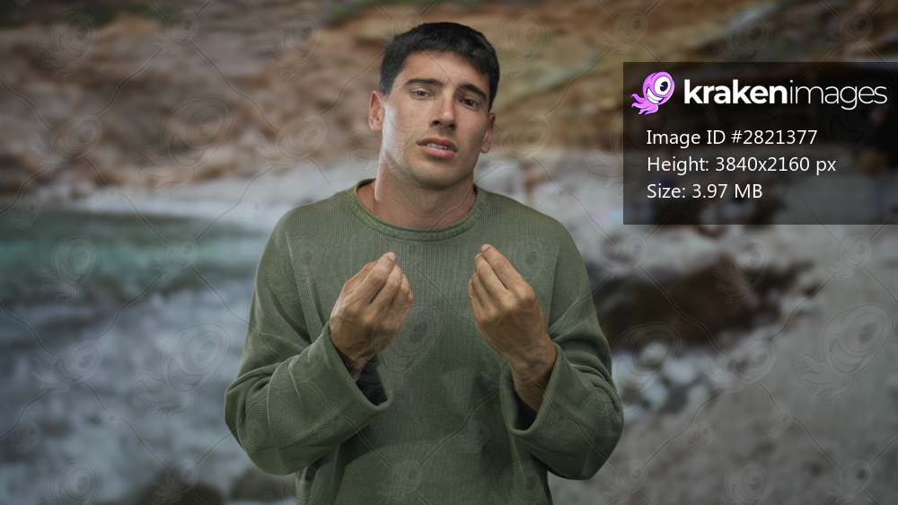 Hispanic man spreads hands at rocky beach under warm sunlight showing puzzled shrug gesture; uncertainty.