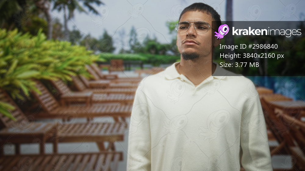 Hispanic man standing with face visible, wearing glasses and cream sweater beside wooden lounge chairs on a resort pool deck; confidence leisure.