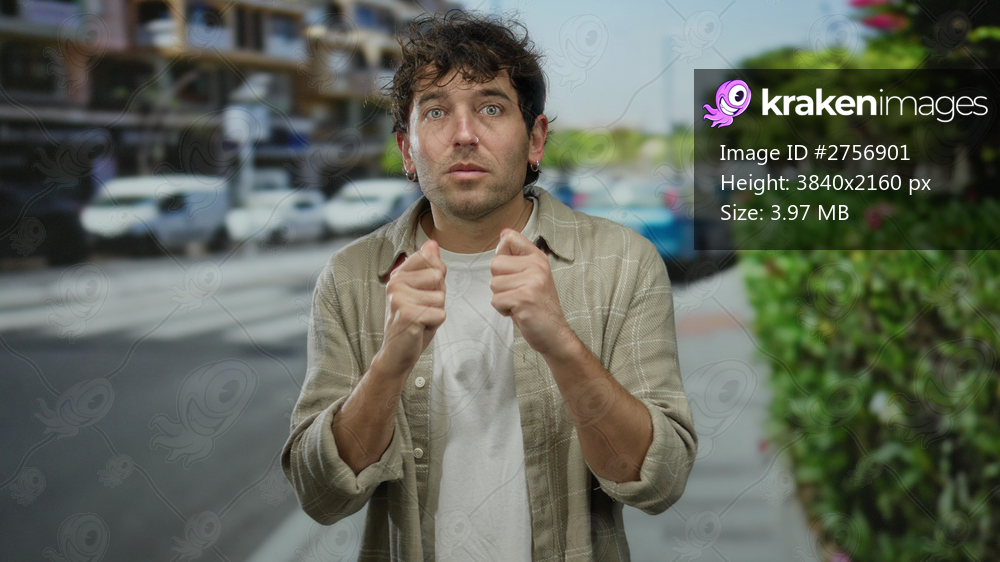 Hispanic man standing handsomely on a sunlit street with blurred cars and greenery in the background, exuding charm in an urban outdoor setting.