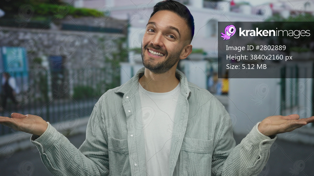 Hispanic man standing on urban street with outstretched hands in a thoughtful decision-making gesture, blending casual style with urban cityscape in background. - Kraken Images