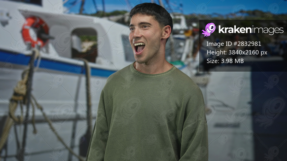Hispanic man standing smiling and looking at camera by docked white boats at sunny crowded port pier; relaxation.