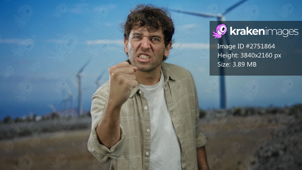 Hispanic man stands defiantly in a wind turbine field, expressing determination under a clear blue sky, surrounded by multiple windmills in an open landscape - Kraken Images
