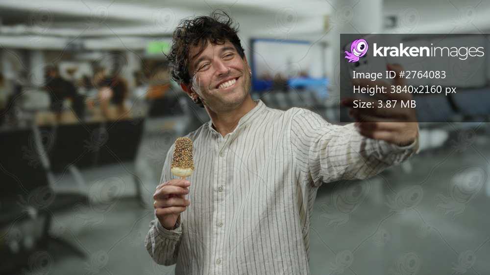 Hispanic man taking a selfie with an ice cream at the airport, capturing a joyful moment indoors while holding a phone.