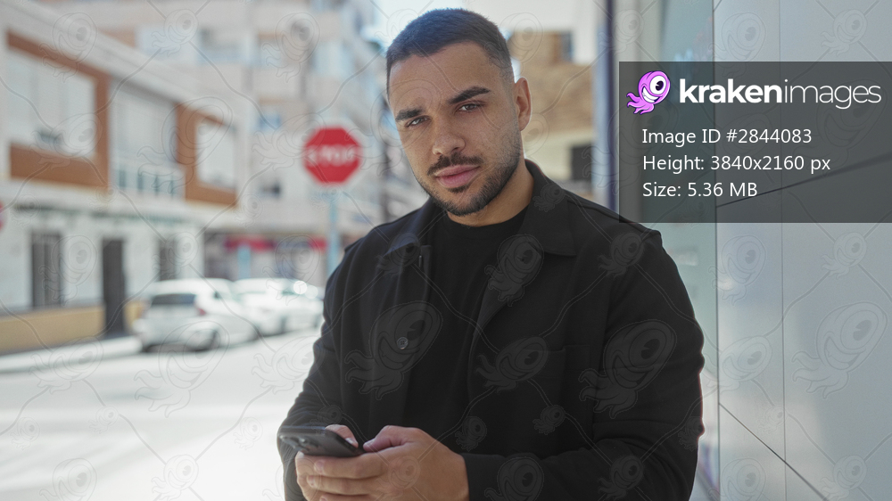 Hispanic man taps smartphone screen on sunlit street against modern building facade; focus connection.