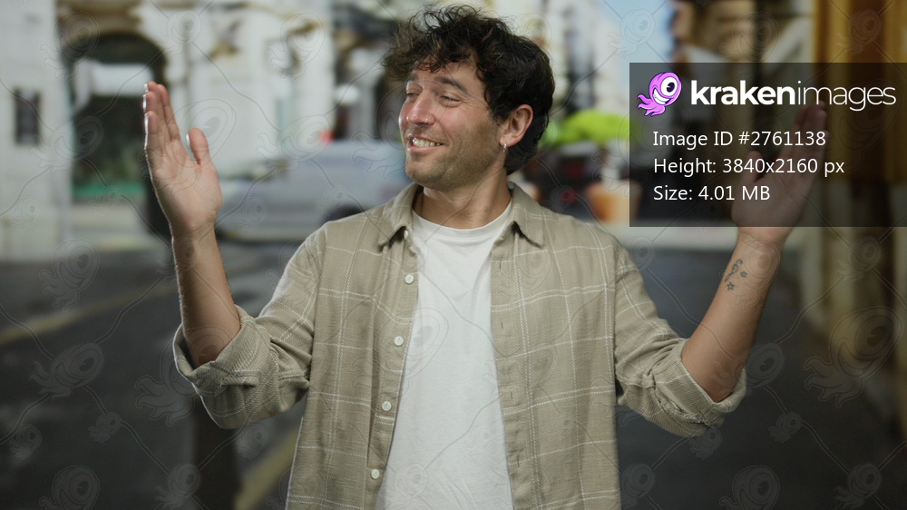Hispanic man with tattoo expressing size with hands on a lively street setting, embodying charm and casual style in an outdoor urban environment.