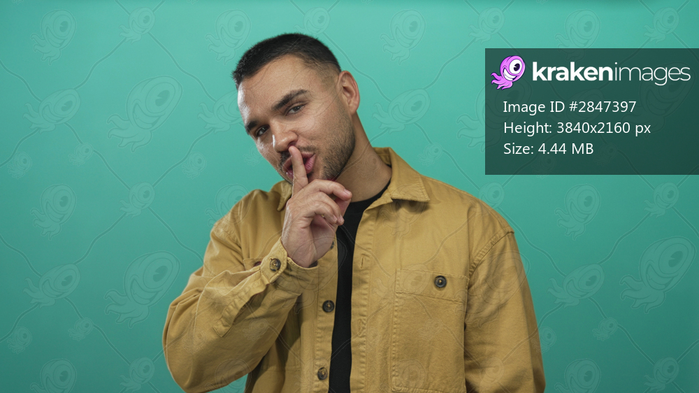 Hispanic man tilting head and pressing finger to lips for hush in studio setting with contemplative expression; secrecy.