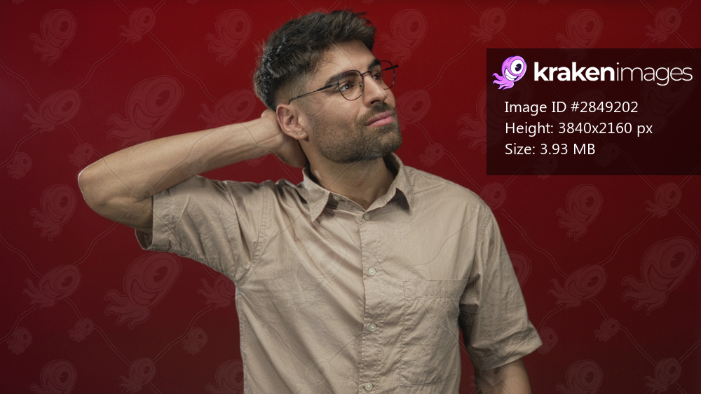 Hispanic man touching neck with hand against red studio wall, eyes closed and head tilted slightly in thoughtful posture; inner unease.