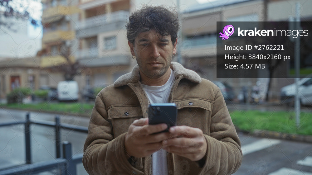 Hispanic man using smartphone outdoors on an urban street, looking contemplative wearing a brown jacket, with parked cars and buildings in the background. - Kraken Images