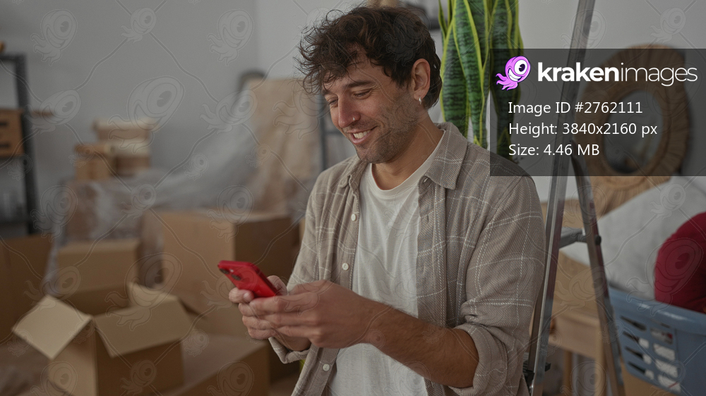 Hispanic man using smartphone while sitting in a new home surrounded by moving boxes, ladder, and houseplants.
