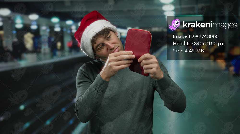 Hispanic man wearing a christmas hat examining his wallet thoughtfully in a busy subway station amid the hustle of urban commuting.